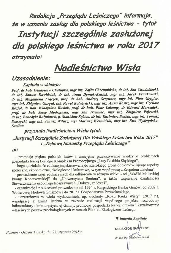 Nadleśnictwo Wisła Instytucją Roku 2017!